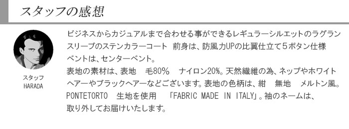ステンカラーコート ラグランスリーブ ビジネススーツにぴったりのビジネスタイプのシルエットのコート!